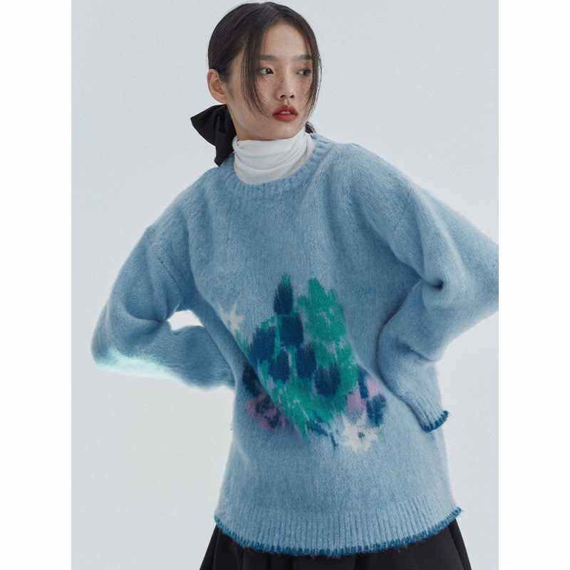 雾霾蓝牛绒毛套头毛衣女2021秋冬新款宽松百搭针织衫独立设计图案热门设计联盟服务商