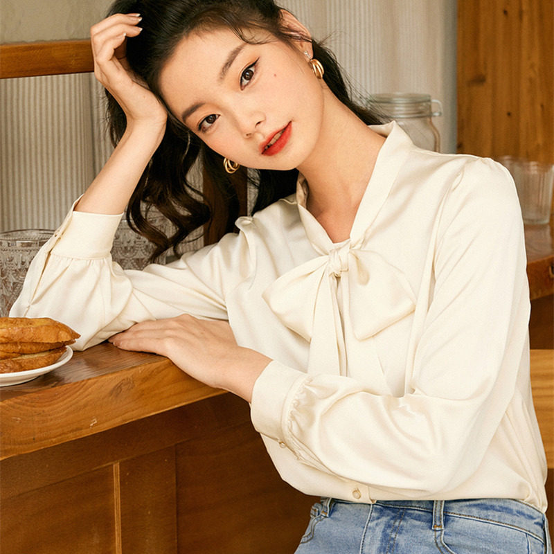 2021新款秋装垂感缎面蝴蝶结系带衬衣上衣 知性优雅飘带领设计热门设计联盟服务商