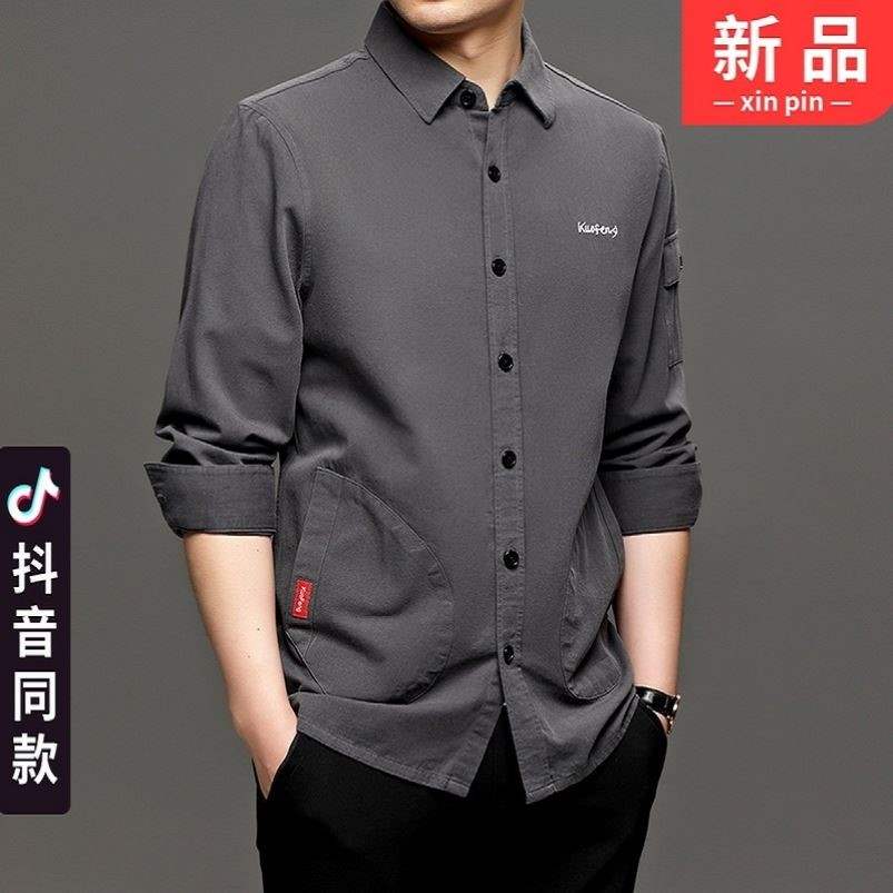 势臣男装新款春夏工装长袖衬衫薄款外套纯色韩版翻领潮流衬衣夹克热门设计联盟服务商